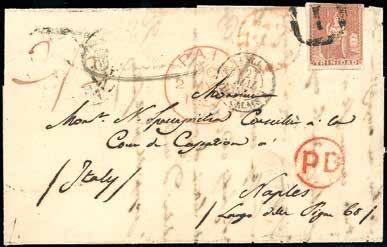 NAPOLI -TRINIDAD AND TOBAGO - April 1857, letter from Trinidad to Naples prepaid to destination: the 1 p. postage stamp (Yv. 4) short upside paid the domestic single rate (under 1/2 ounce) of Trinidad, 2s 2d was credited to UK for the double rate foreign transit (weight exceeding 1/4 ounce).
