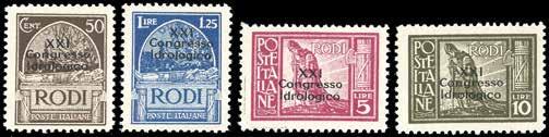 2244 ** SOMALIA SERVIZIO AEREO 1934 - 50 cent, 75 cent., 80 cent., 1 lira e 2 lire posta aerea Arte Coloniale (A2/A6), soprastampati “11 nov 1943 Servizio aereo speciale” (Sass. nota pag.1086), due esemplari con la soprastampa dritta e una coppia con la soprastampa capovolta per ciascun valore, gomma originale integra, ossidazioni su alcuni valori e un esemplare da 50 cent. difettoso. Raro insieme.