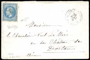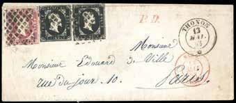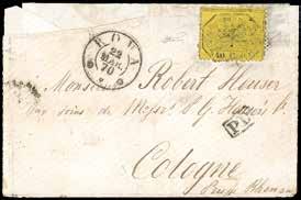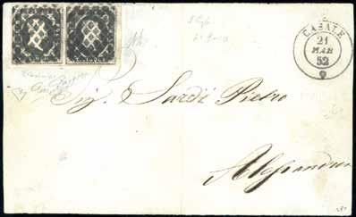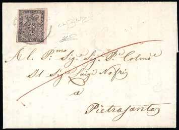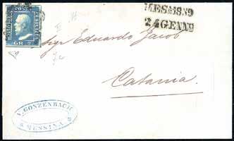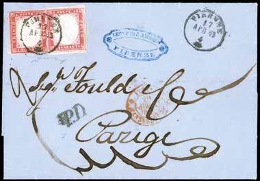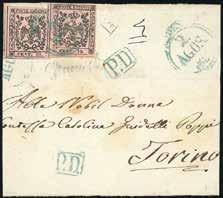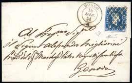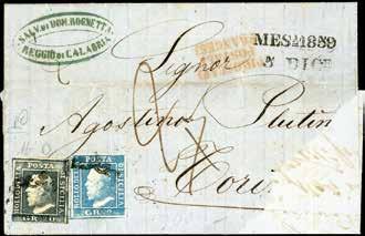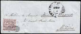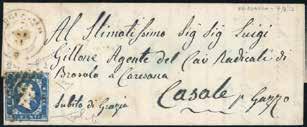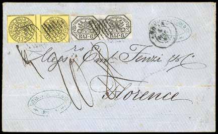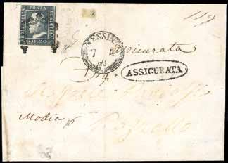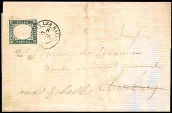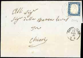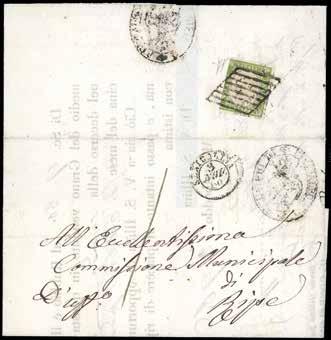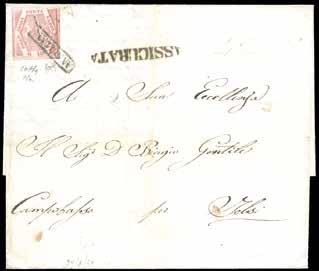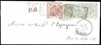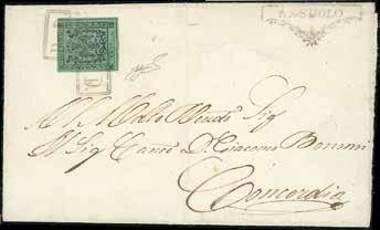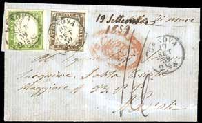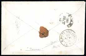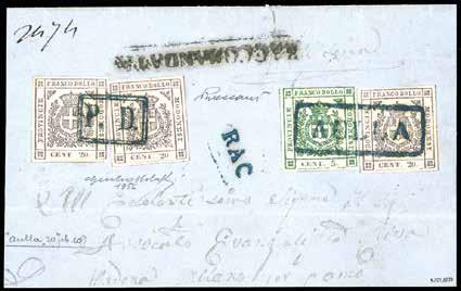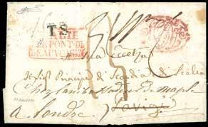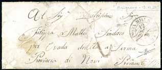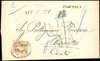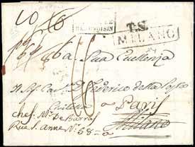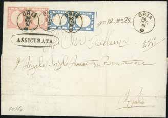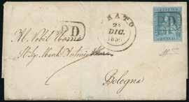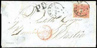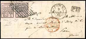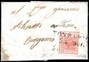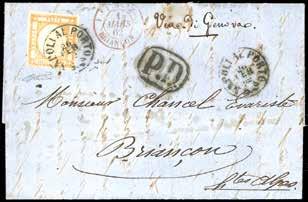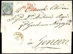 1 * 1845 - Lettera prefilatelica raccomandata franca a destino da Bergamo 13/11/1845 a Lione, bolli “franca”, PD e “raccomandata” in rosso. Al verso il conteggio della tassa prepagata di 24 carantani. Rara. Chiavarello. Ex coll. Imperato.