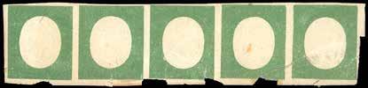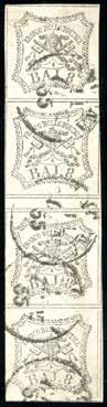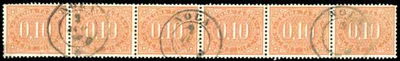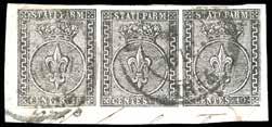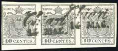 6 1850 - 10 cent. grigio nero, I tiratura (2b), striscia di tre, il primo esemplare con varietà di clichè, perfetta, usata a Chiari 14/5. Ferrario.