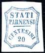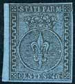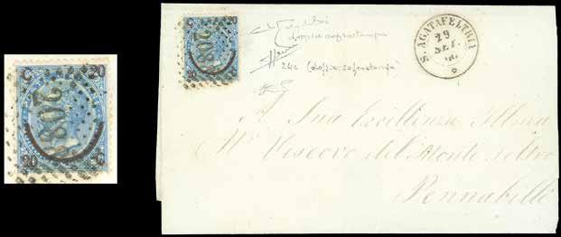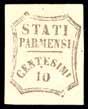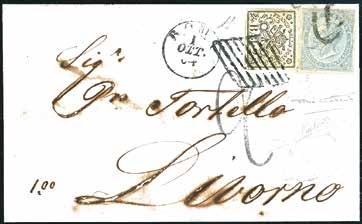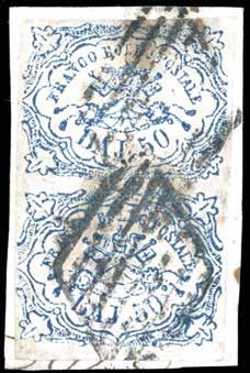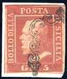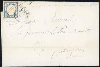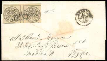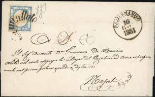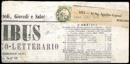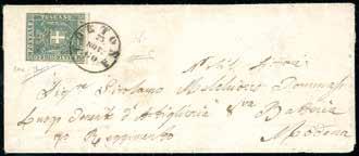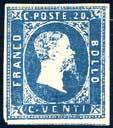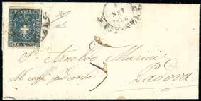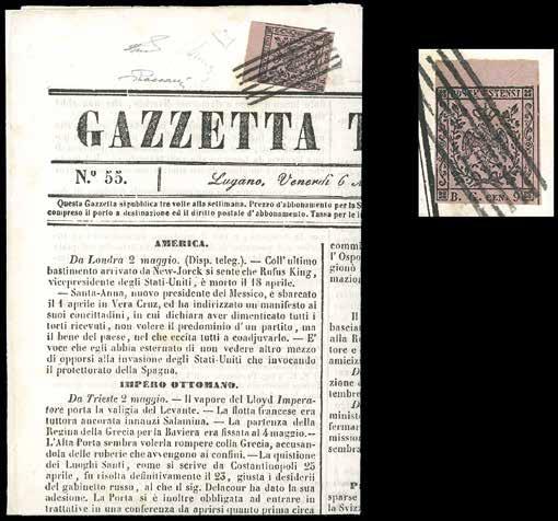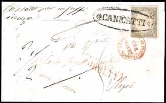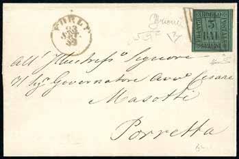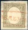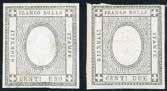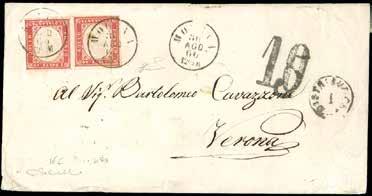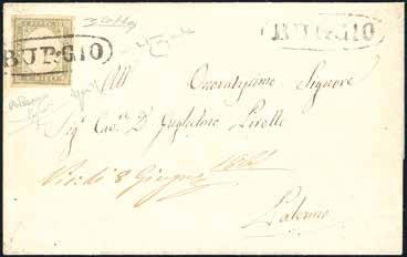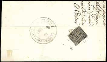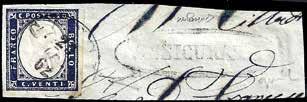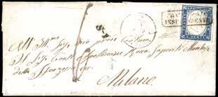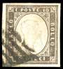 7 1850 - 10 cent. grigio nero, I tiratura, ritocco della dicitura “centes” (2b/k), perfetto, usato a Milano. Varietà molto rara, specie negli esemplari della I tiratura. Cert. Sorani e Fiecchi. (cat.Sassone € 12.000 in proporzione).