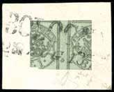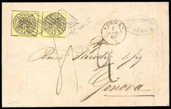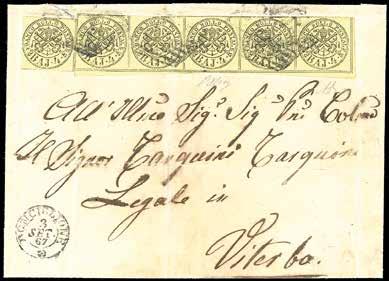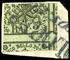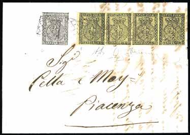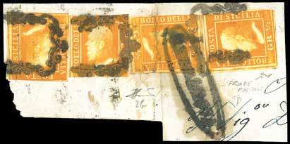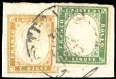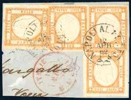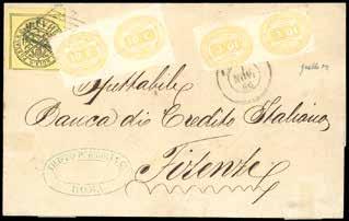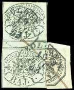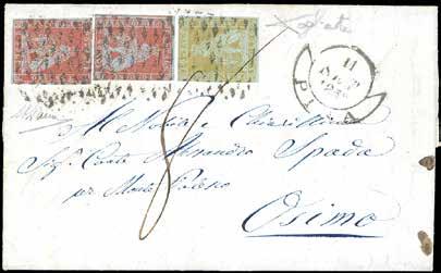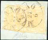 3 r 1850 - 5 cent. giallo ocra (1), tre esemplari usati a Milano su frammento, sovrapposti alla maniera austriaca (treppenfrankatur). Insieme unico! G.Oliva, cert. Sorani.