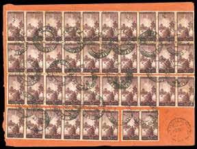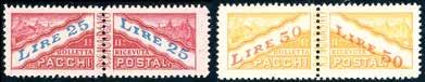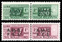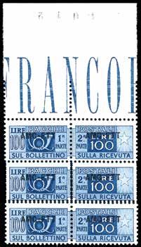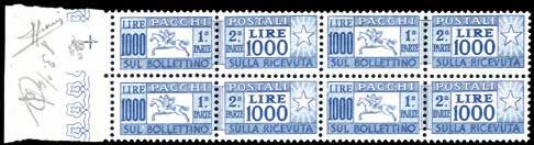 2582 * REPUBBLICA ITALIANA PACCHI IN CONCESSIONE 1955/1985 - Eccezionale collezione di circa novanta moduli per multe ai corrieri (mod. 168B), affrancati con le speciali marche e i francobolli per pacchi postali usati interi, spesso in grandi blocchi, in tre eleganti album. Notati oltre centotrenta esemplari dei valori da 50 lire, 75 lire e 110 lire rosa, con filigrana ruota o stelle. Sono presenti inoltre numerose bollette con le marche intere annullate “il controllore”, nonché bollette e bollettini vari.