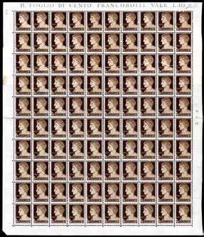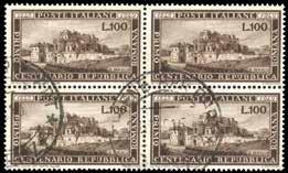 2581 ** REPUBBLICA ITALIANA 1955/1977 - Accumulazione di quartine del periodo, anche molto ripetute, in una grande scatola.