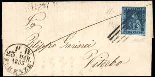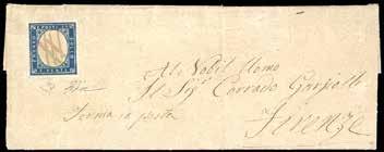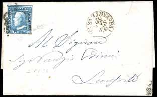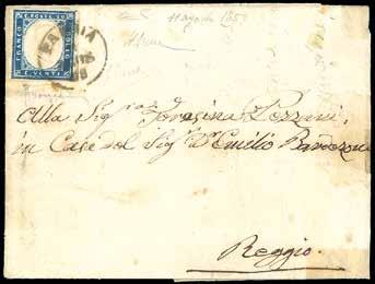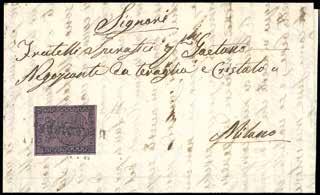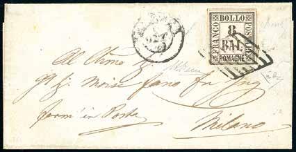 8 * 1855 - 10 cent. nero intenso, carta a mano (2d), perfetto, isolato su lettera da Milano 25/8/1855 per città. Ferrario, cert. Sorani.