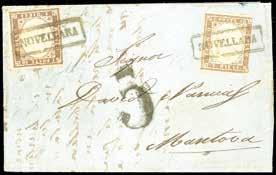 12 * 1851 - 15 cent. rosso vermiglio, due esemplari, 15 cent. rosso vermiglio chiaro, tutti I tipo, carta a mano (3e,3f), perfetti, su sovracoperta di lettera da Verona 11/2/1851 a Vienna. Bella e non comune affrancatura di valori gemelli di tinte differenti. Ferrario.