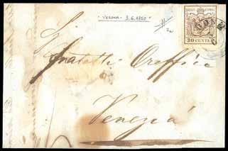 14 * 1850 - 30 cent. bruno chiaro, I tiratura, carta a mano (7a), perfetto, su lettera da Verona 3/6/1850 a Venezia. Pregevole lettera risalente al terzo giorno d’emissione del francobollo. Cert. Sorani.