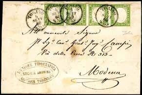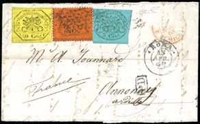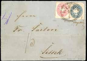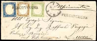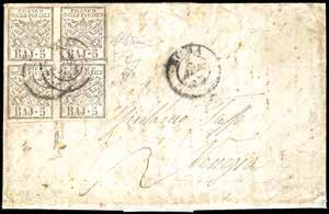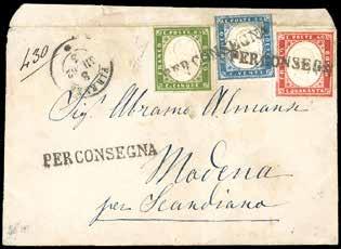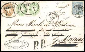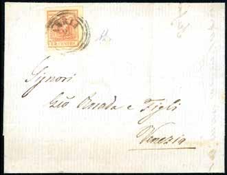 4 * 1852 - 5 cent. giallo ocra, 10 cent. grigio nero, 15 cent. rosa, II tipo, tutti carta a macchina (1,2c,5), perfetti, su lettera da Venezia 11/1/1852 a Trieste, dove i francobolli vennero annullati con il lineare “C.V. da Venezia” (punti 6). Rara affrancatura tricolore. Sorani, cert. Ferrario.