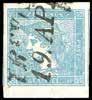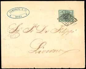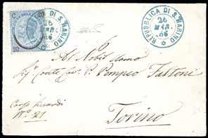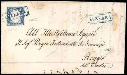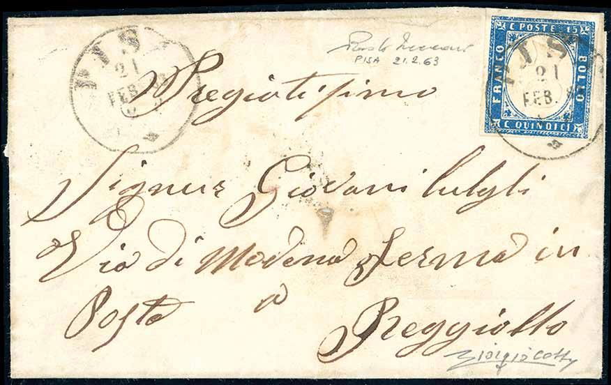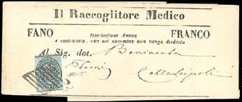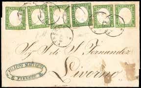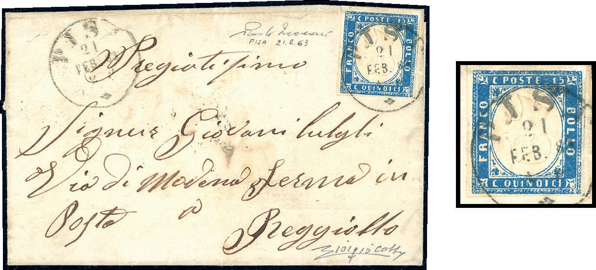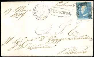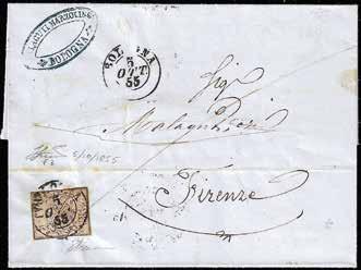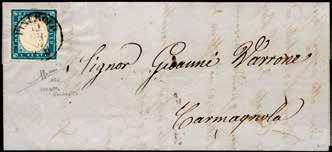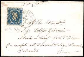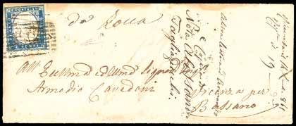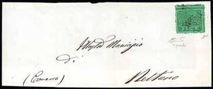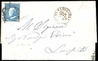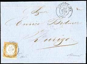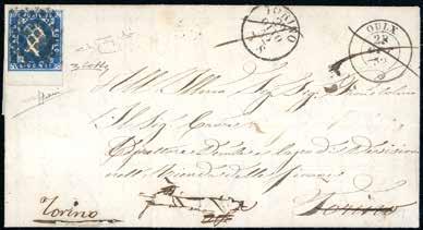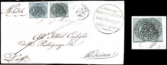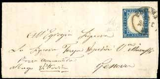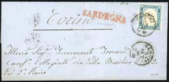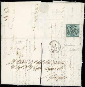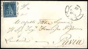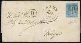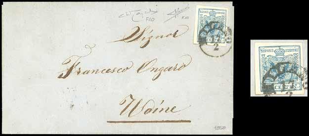 6 * 1851 - 10 cent. nero (2), perfetto, isolato su sovracoperta di lettera da Verona 1/4 per città, bollo d’arrivo. Inusuale involucro azzurro. Ferrario.