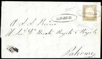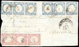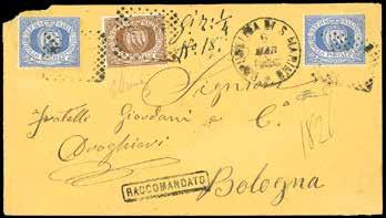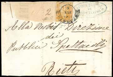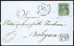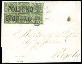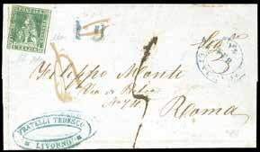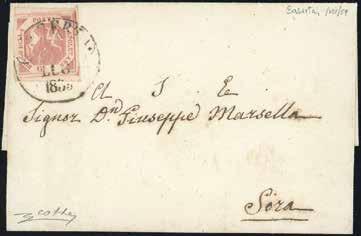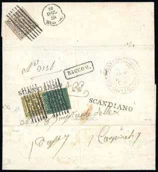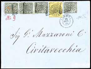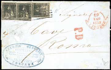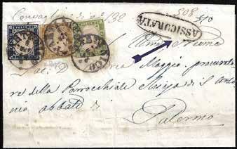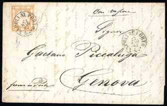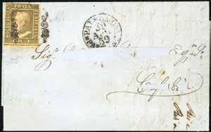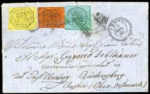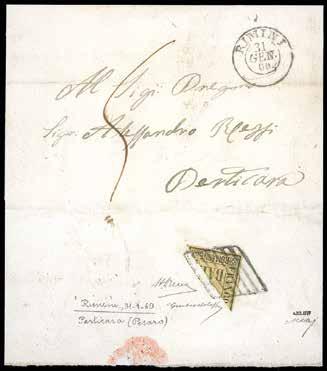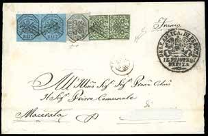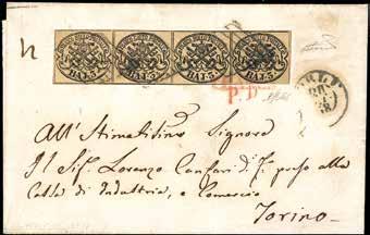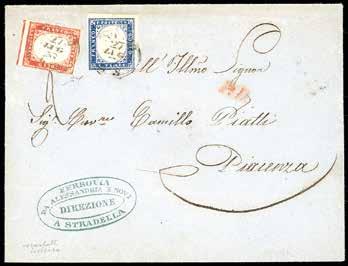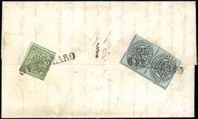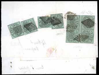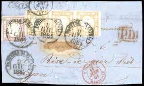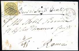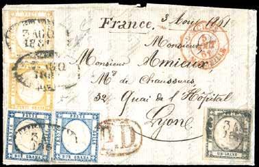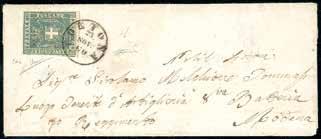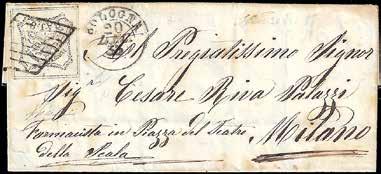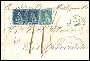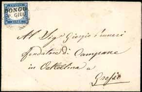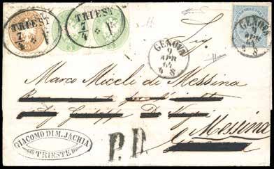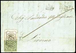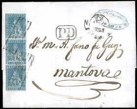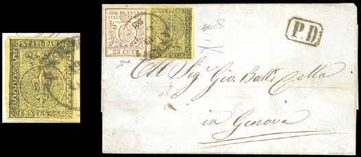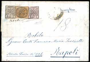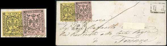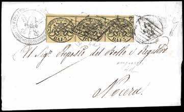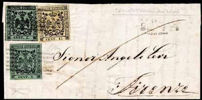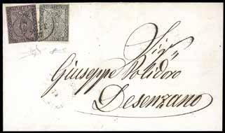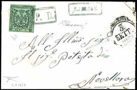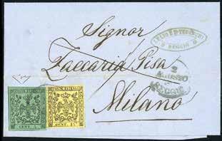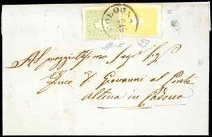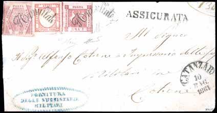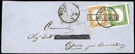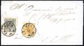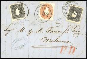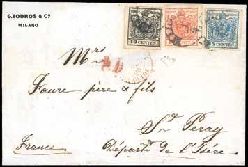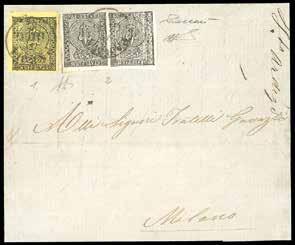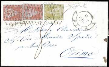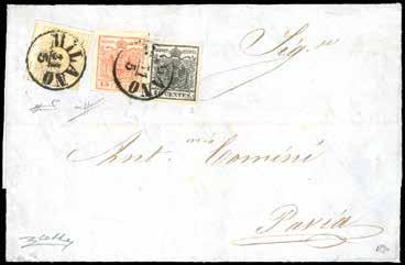 4 * 1856 - 5 cent. giallo ocra, 10 cent. nero, 15 cent. rosso III tipo (1,2,6), perfetti, su lettera da Milano 31/5/1856 a Pavia. Non comune tricolore. Sorani, Colla, cert. Ferrario.