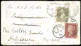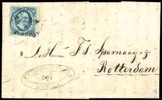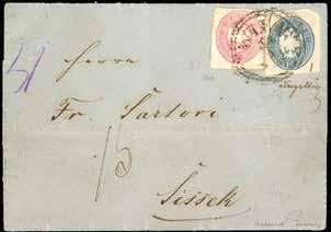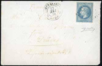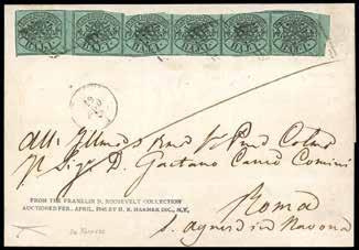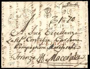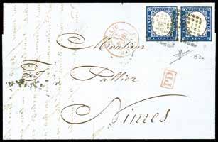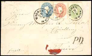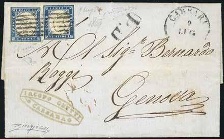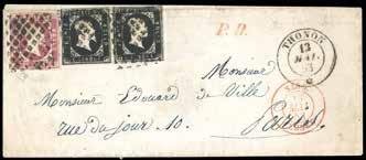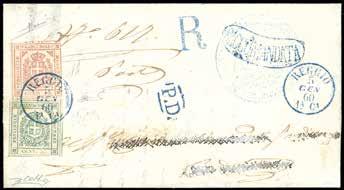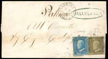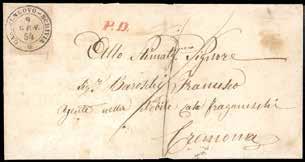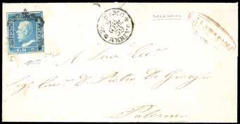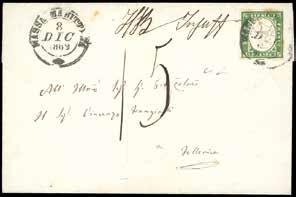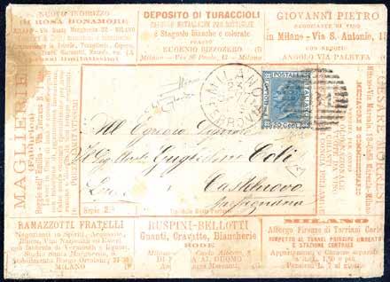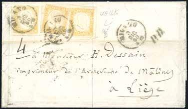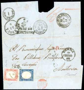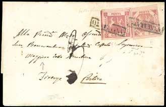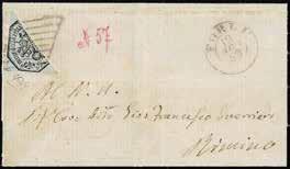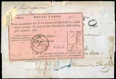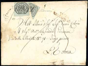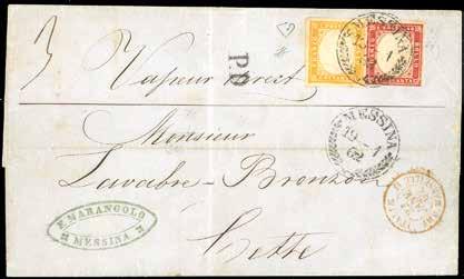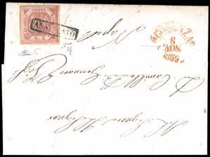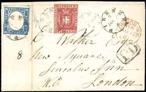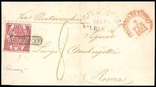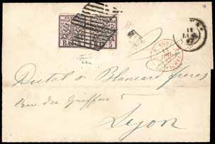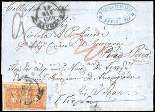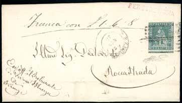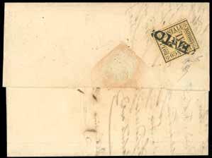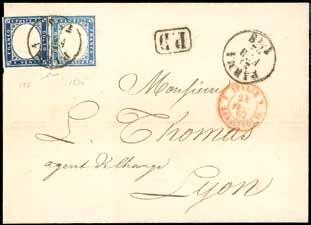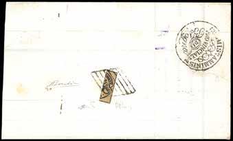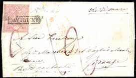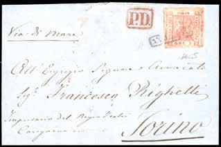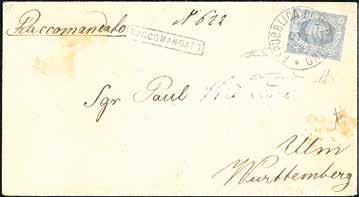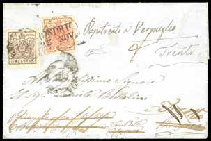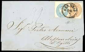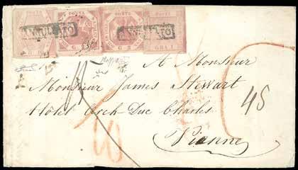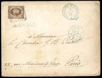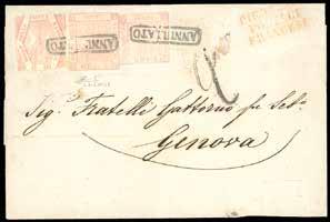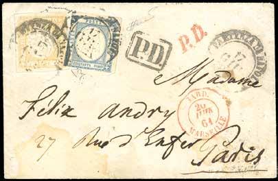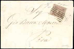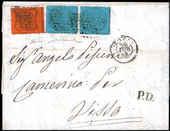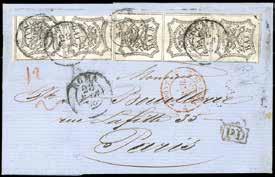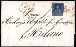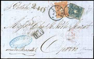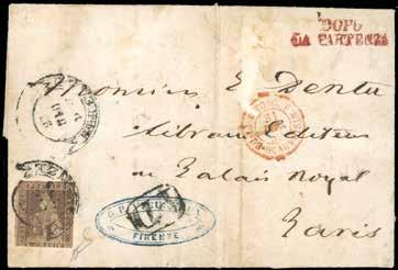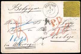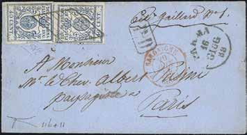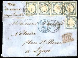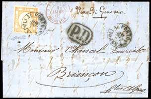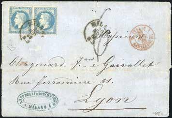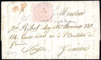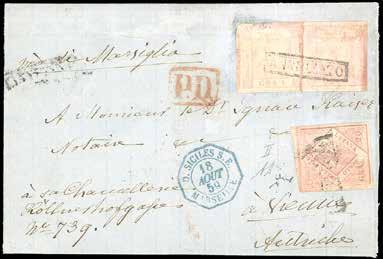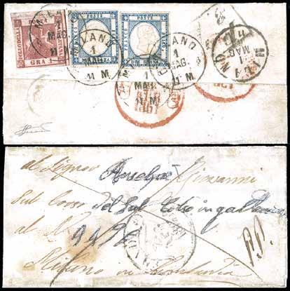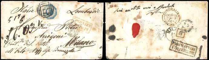 1 * INCOMING MAIL BRITISH COLONIES-VICTORIA AUSTRALIA 1856 - Double-rate letter (1/2-1 ounce) from Melbourne to Milan, 1 s (Yv. 7) lightly short on the left, only to the U.K. then considered unpaid. The letter was carried by the clipper Joseph Tarrat of the Black Ball line from Port Philip, via Cape Horn, to England. In London the red boxed handstamp “COLONIES/ART-18” was struck, referring to the article of the Anglo-French Convention debiting France 3 s 4 d for each 30 grams of letters carried to France. Since the letter exceeded 15 grams of weight, the French debit amounted to 51 decimes (3x17 decimes), corresponding to 6 Astrian lire. The addresses was also charged the Austrian inland rate of 3 krCM for a letter weighing less than a Weiner Lot (17.5 grams) and a destination under 75 km distant from the Austro-Sardinian border. The only recorded letter from Victoria to Lombardy Venetia that carries Victorian postage stamps. Cert. R.P.S. (ex coll.Mentaschi).