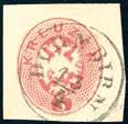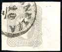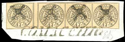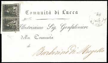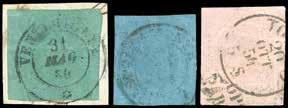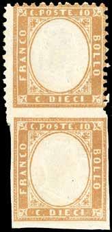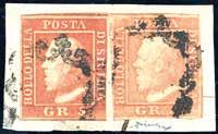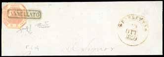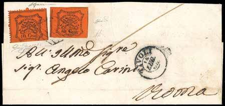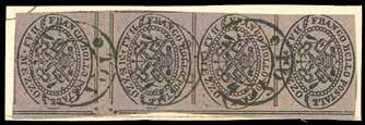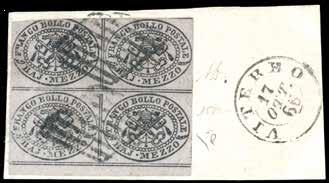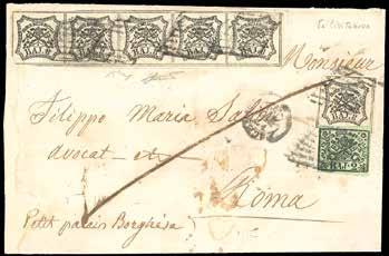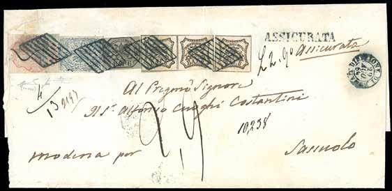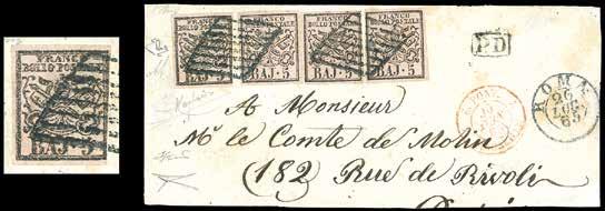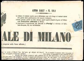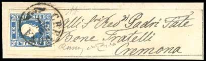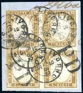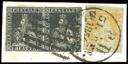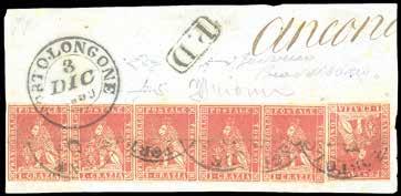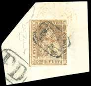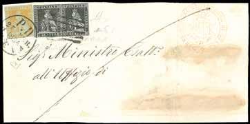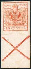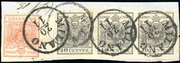 9 r 1850 - 10 cent. nero, striscia orizzontale di tre esemplari con l’ultimo ritoccato, dicitura “CENTES” rifatta e 15 cent. rosso (2,2k,6), tutti perfetti, su frammento usato a Milano. Insieme splendido e rarissimo! Si conosce solo una striscia analoga su busta, quotata € 35.000 dal Sassone. Cert. Ferrario.