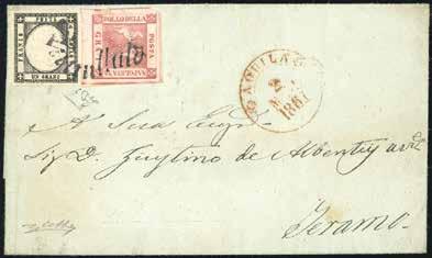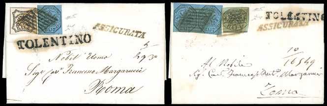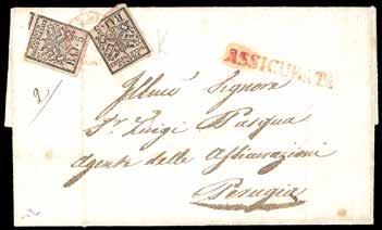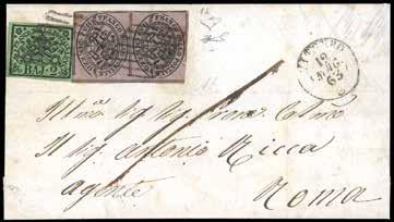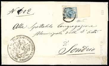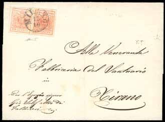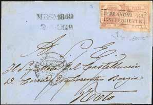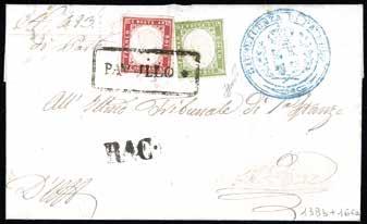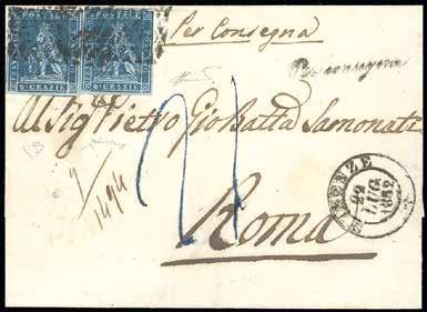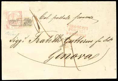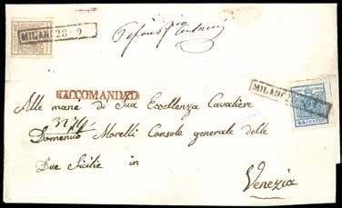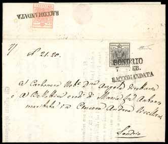7 * 1851 - 10 cent. nero e al verso 15 cent. rosa, II tipo, entrambi carta a mano (2,5), perfetti, su lettera raccomandata da Sondrio 7/2/1851 per città. Il francobollo al verso per il diritto di raccomandazione è annullato con il solo lineare accessorio “raccomandata” (punti 10). Pregevole insieme. Ferrario.