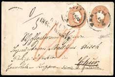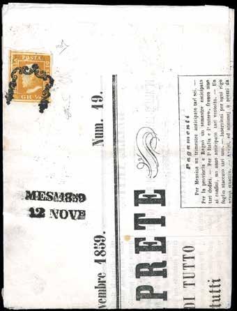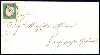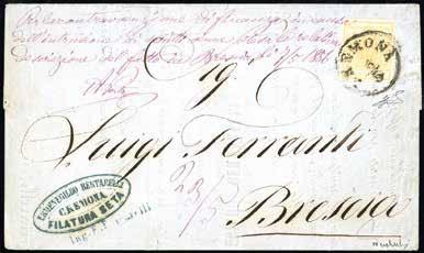 3 * 1856 - 5 cent. giallo ocra (1), perfetto, isolato su circolare a stampa a Cremona 6/5/1856 a Brescia. Sul fronte manoscritto “Per la contravvenzione di finanza in causa dell’intrusione di scritti venne stesa la descrizione del fatto in Brescia” e la lettera venne tassata 5 carantani: 2 kr. per il porto mancante, 3 kr. di soprattassa. Estremamente rari gli stampati tassati per il contenuto non ammesso. Da esposizione! Ferrario cert. Ferchenbauer.