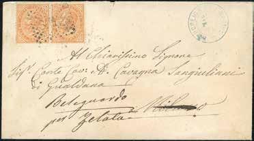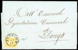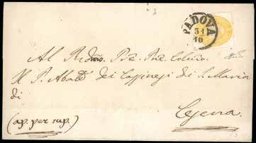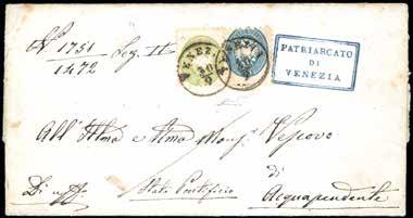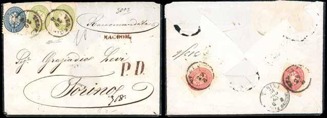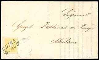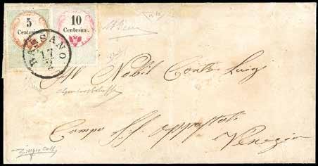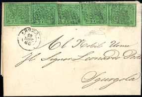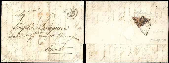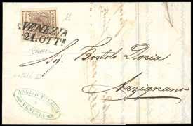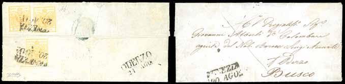 5 * 1950 - 5 cent. giallo, I tiratura (1a), tre esemplari, perfetti, applicati per errore al verso, in contrasto con il regolamento postale, di lettera da Venezia 20/8/1850 a Busco, Oderzo. Insieme interessante e raro. A.Diena, Colla.