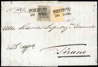 2 * 1851 - 5 cent. giallo ocra, 10 cent. nero, carta a mano (1,2), perfetti, su lettera da Sondrio 20/5/1851 a Tirano.