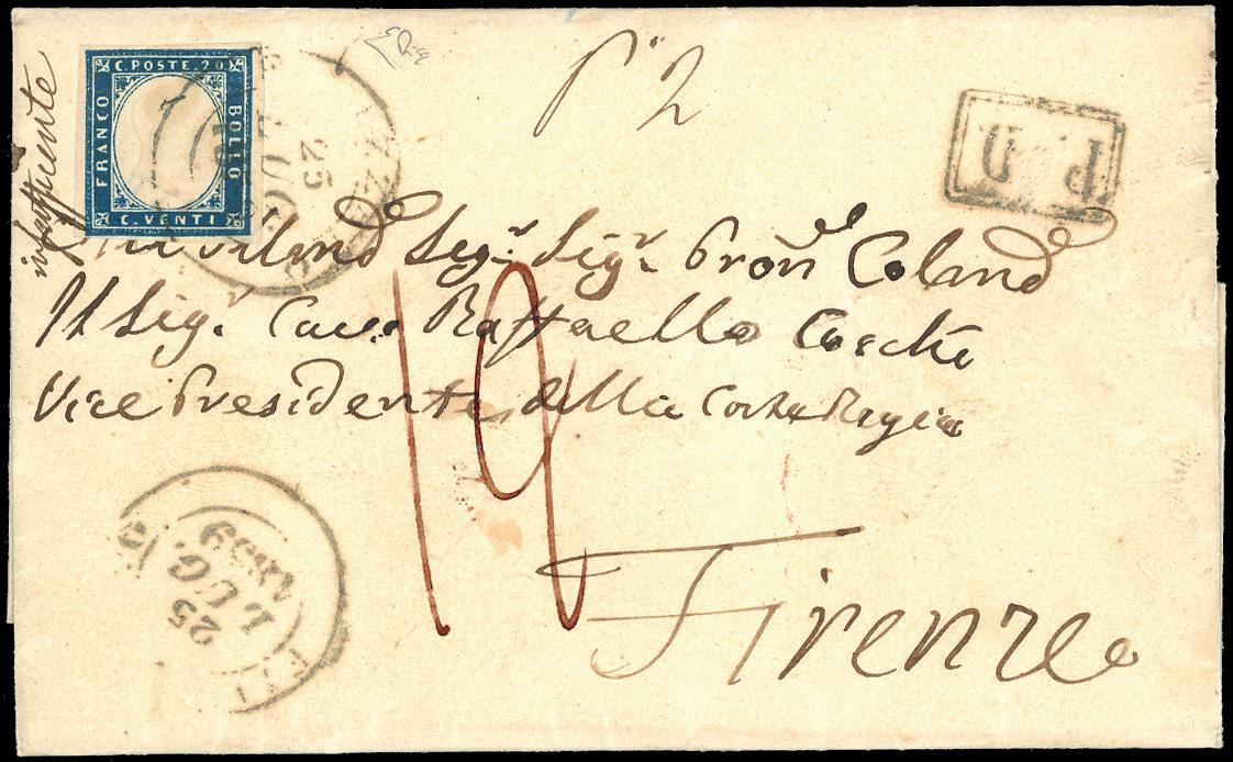29 * 1858 - 45 cent. azzurro, III tipo, carta a macchina (22), ottimo stato, su sovracoperta di lettera da Milano 19/1/1858 a Firenze, bollo rosso “dopo la partenza”.