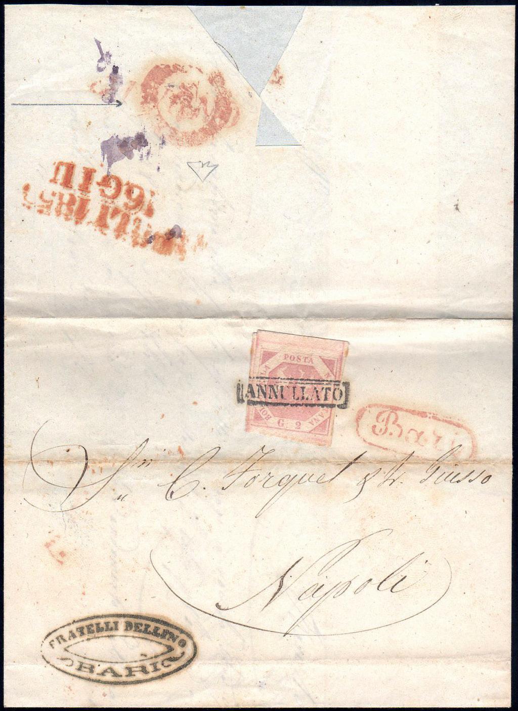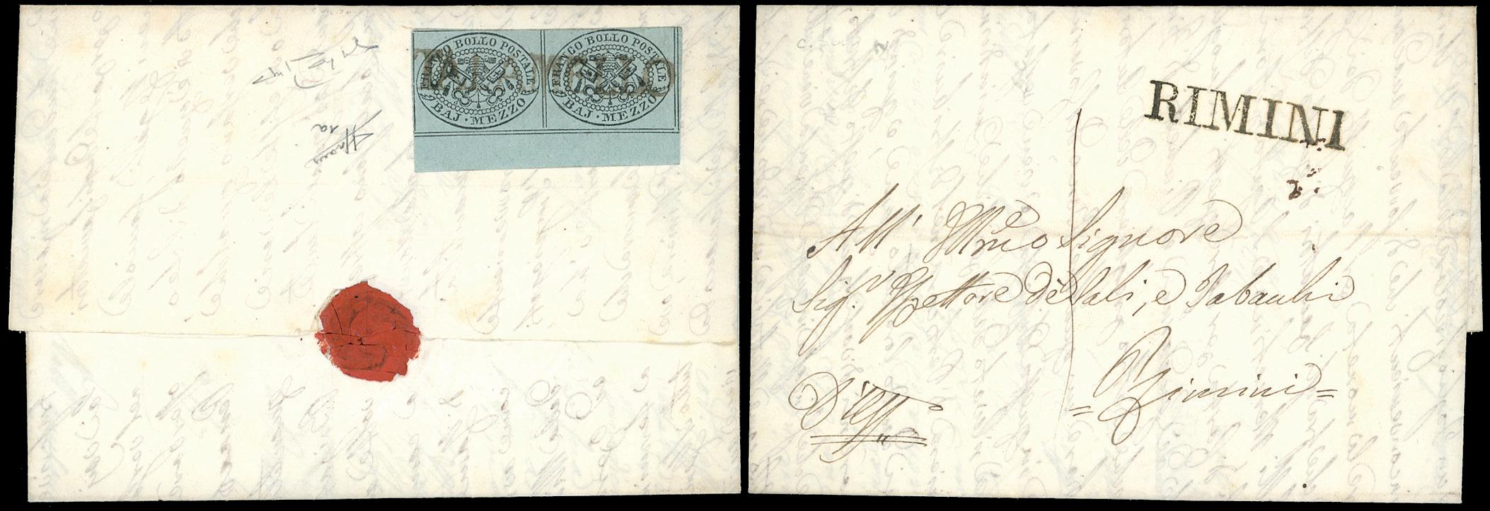 6 * 1851 - 15 cent. rosso, I tipo, carta a mano (3), due esemplari, uno perfetto, l’altro difettoso in basso, su sovracoperta di lettera da Pavia 27/8/1851 a Laveno per Mombello. Sotto il primo francobollo è visibile una porzione di un ulteriore francobollo, precedentemente annullato sulla lettera. Curiosa!