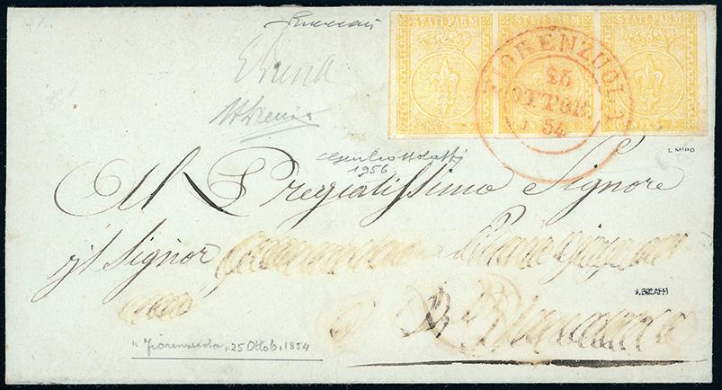 7 * 1850 - 15 cent. rosso, I tiratura (3a), striscia orizzontale di tre perfetta e bellissima, su lettera da Milano 13/9/1850 a Ponte di Brenta. A.Diena, cert. Raybaudi.