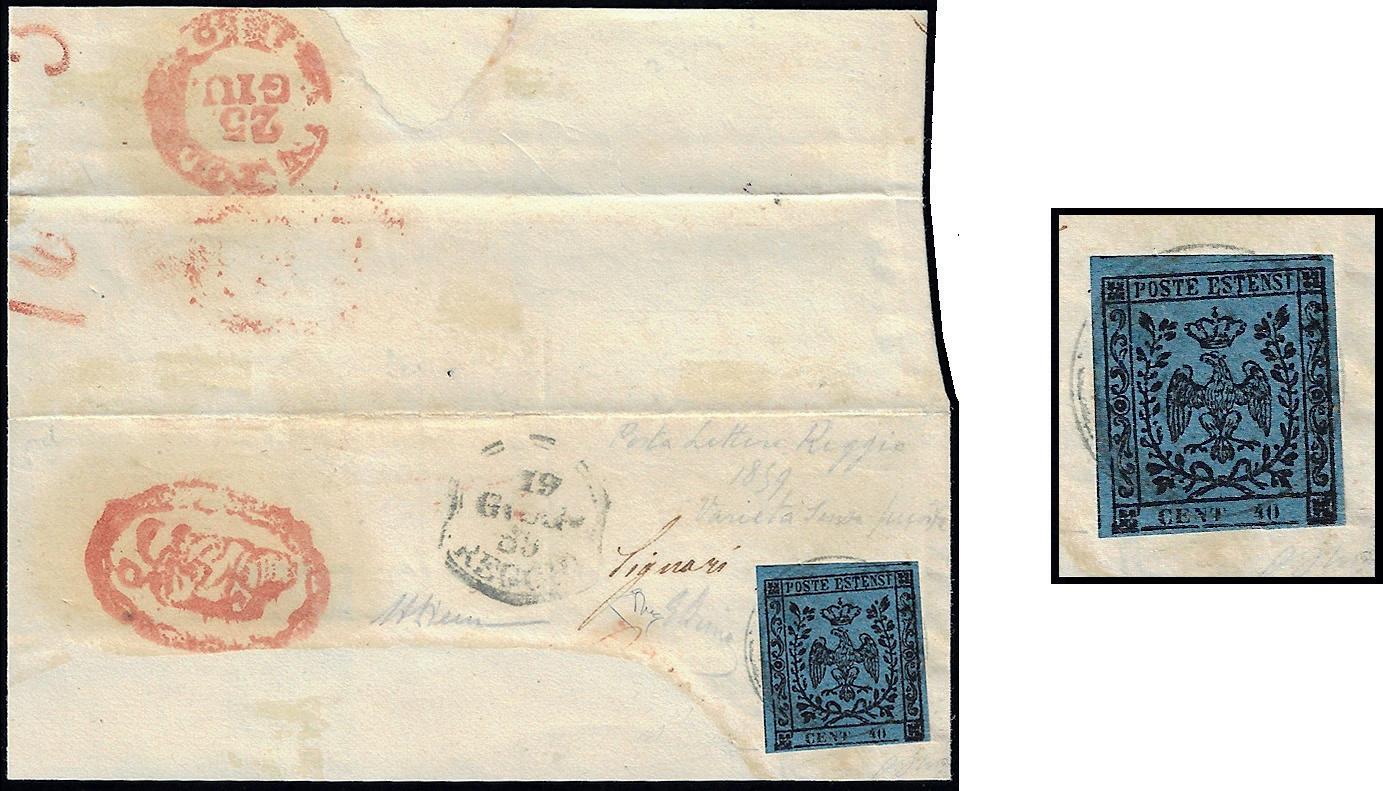 19 * 1854 - 45 cent. azzurro ardesia, I tipo, carta a mano (11), lieve piega orizzontale, su lettera da Milano 10/9/1854 a Modena, bollo rosso “franco frontiera” e tagli di disinfezione. R.Diena.