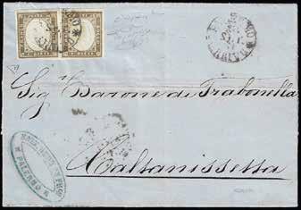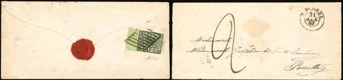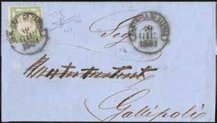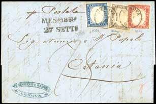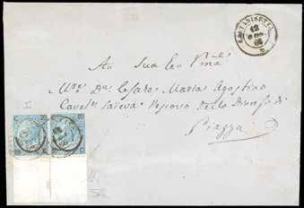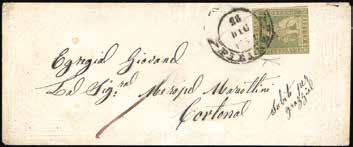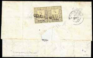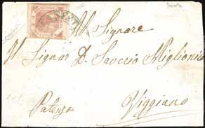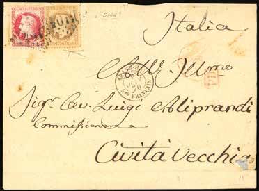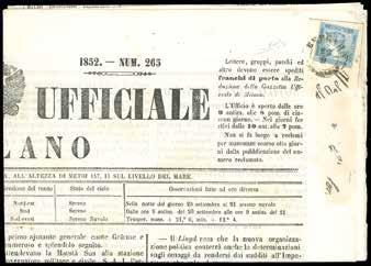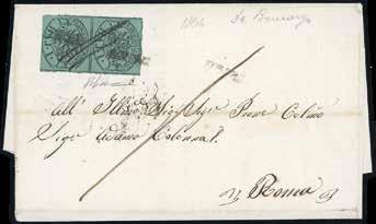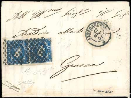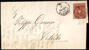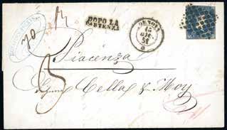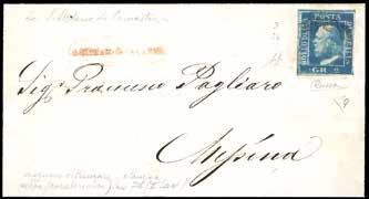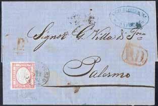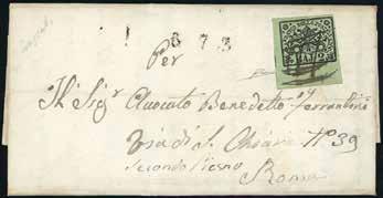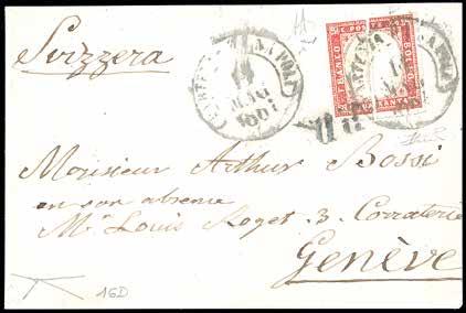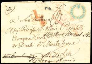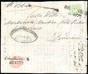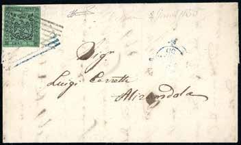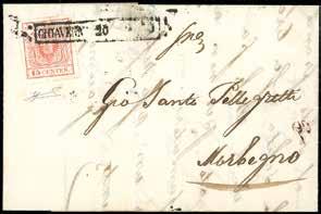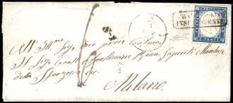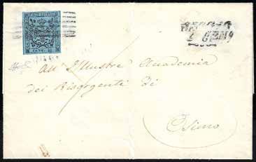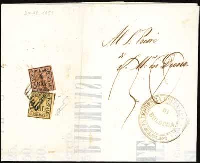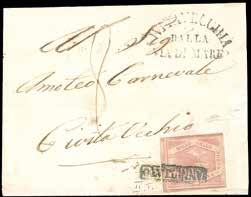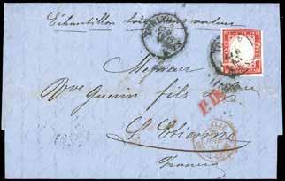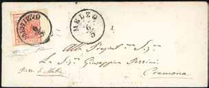 11 * 1852 - Lettera spedita da Mosca, in Russia, in porto pagato in denaro, bollo di partenza “Moscau” e stampatello diritto in rosso “Porto”, a Milano, via di Vienna, dove fu tassata e detassata. Giunta a Milano il 22/7/1852 fu rispedita ad Alzano previa affrancatura con 15 cent. rosa, II tipo (5), perfetto. La missiva già molto rara per la sua provenienza, è il primo caso, in ordine temporale, di lettere spedite dalla Russia, verso gli Antichi Stati Italiani, giunta a destino affrancata con un francobollo. Per grande collezione specializzata. Cert. Bottacchi e Ferrario.
