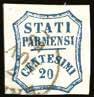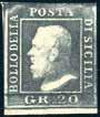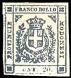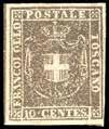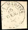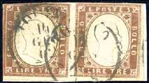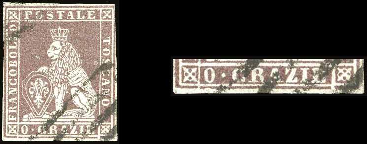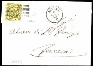 7 1850 - 10 cent. grigio nero, I tiratura, ritocco della dicitura “centes” (2b/k), perfetto, usato a Milano. Varietà molto rara, specie negli esemplari della I tiratura. Cert. Sorani e Fiecchi. (cat.Sassone € 12.000 in proporzione).
