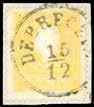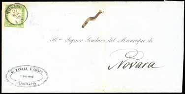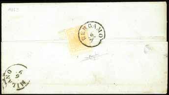 4 * 1853 - 5 cent. giallo ocra (1), ottimo stato, isolato al verso, come chiudilettera di circolare a stampa da Bergamo 6/9/1853 a Milano. Raro uso isolato al verso del francobollo, in contrasto con la normativa postale. Cert. Raybaudi.