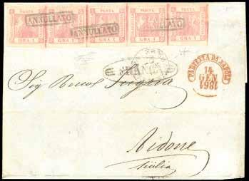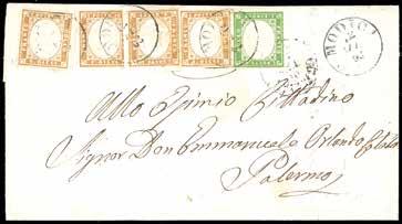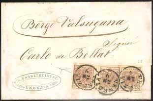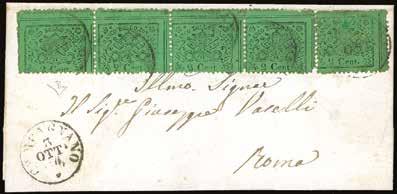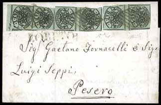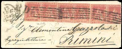 5 * 1854 - 5 cent. giallo arancio (1g), striscia orizzontale di sei, perfetta, il primo esemplare con pli d’accordeon, su lettera da Milano 1/7/1854 a Brescia. Affrancatura estremamente rara “una tra le massime del 5 centesimi” secondo il cert. Colla. Firmata Grioni.