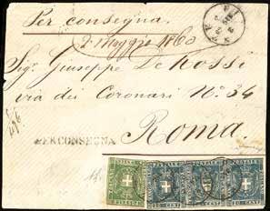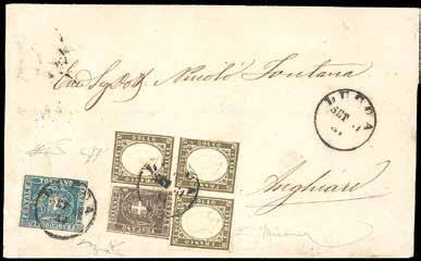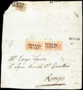 12 * /(*) 1852 - 15 cent. rosa carminio intenso, II tipo, carta a mano, quattro esemplari di cui tre perfetti e uno con piega verticale, e, al verso per il diritto di raccomandazione 30 cent. bruno, carta a coste verticali, parziale angolo di foglio, perfetto (5b,16), su frontespizio completo con parte del verso di lettera raccomandata da Padova 10/1/1852 a Rovigo. Pregevole affrancatura. Bottacchi.