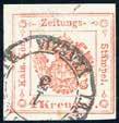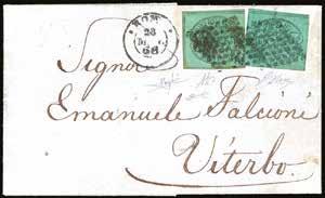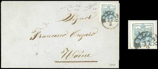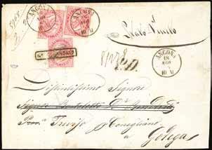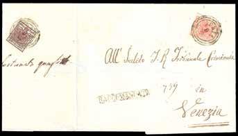 10 * 1854 - 15 cent. rosso carminio, I tiratura, 30 cent. bruno lillaceo, II tipo, entrambi carta a mano (3b,9), su lettera da Venezia 29/7/1854 a Zara, manoscritto “Col vapore”. I francobolli vennero applicati sovrapposti, come Trappenfrankatur, per nascondere parte dell’annullo stampatello diritto di Milano sul 15 cent., riutilizzato in frode. Interessante e rara frode postale. Cert. Bottacchi.