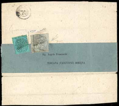 3 (*) 1850 - 5 cent. giallo ocra (1), pli d’accordeon orizzontale, perfetto e ben marginato, su fronte di fascetta di stampato da Milano 24/7 a Schio, bollo d’arrivo sul fronte. Raro uso in tariffa di stampati.