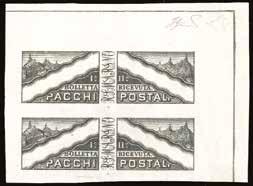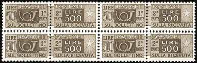 2494 * REPUBBLICA ITALIANA PACCHI IN CONCESSIONE 1955/1985 - Eccezionale collezione di circa novanta moduli per multe ai corrieri (mod. 168B), affrancati con le speciali marche e i francobolli per pacchi postali usati interi, spesso in grandi blocchi, in tre eleganti album. Notati oltre centotrenta esemplari dei valori da 50 lire, 75 lire e 110 lire rosa, con filigrana ruota o stelle. Sono presenti inoltre numerose bollette con le marche intere annullate “il controllore”, nonché bollette e bollettini vari. Si tratta della più vasta collezione del settore finora sviluppata, da esposizione. Insieme unico ed irripetibile per specialista o per dettaglio. Altissimo valore di catalogo.