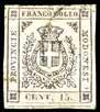 5 1850 - 10 cent. grigio nero, I tiratura, ritocco della dicitura “centes” (2b/k), perfetto, usato a Milano. Varietà molto rara, specie negli esemplari della I tiratura. Cert. Sorani e Fiecchi. (cat.Sassone € 12.000 in proporzione).