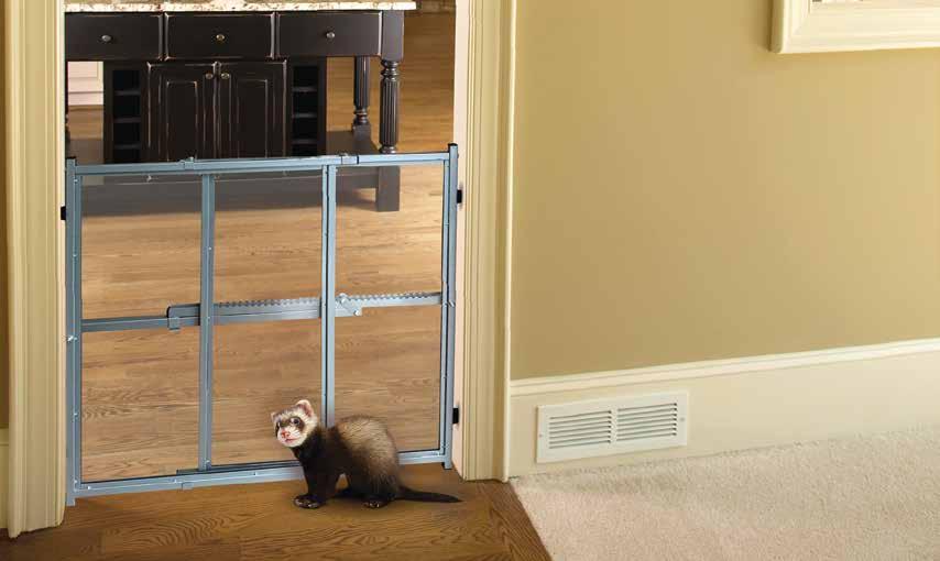 This adjusting gate is completely pet proof! The strong steel frame and thick clear plexi panels leave no room for your pet to sqeeze by and gives you a clear view of your pets from another room. The frame adjusts to fit most doors 24” - 36” wide and is 24” tall.