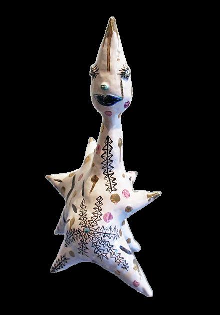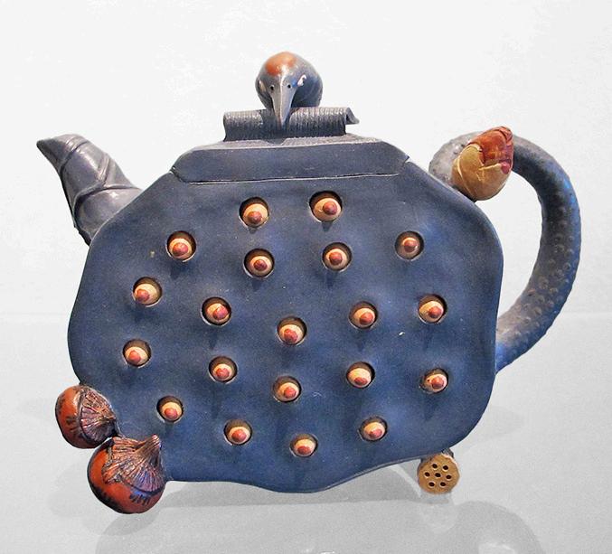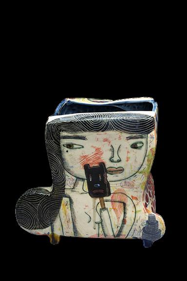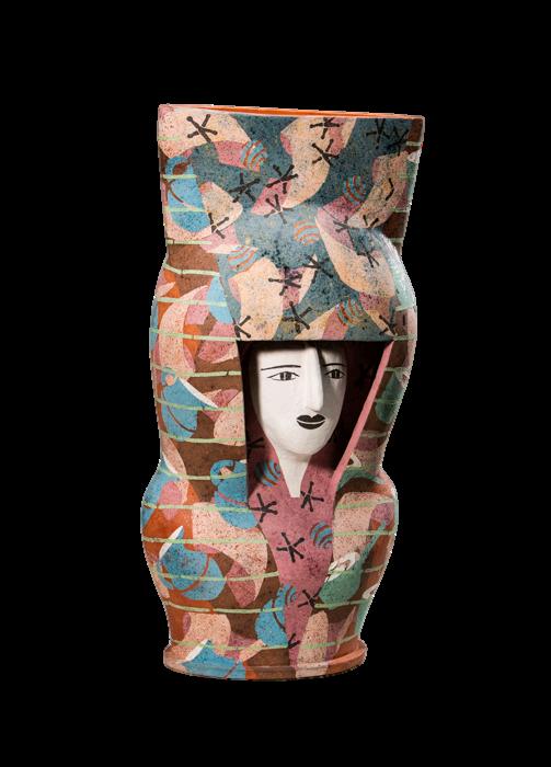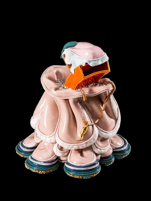One of Schonfeld’s favorite artists was also one of the biggest personalities. British artist Carol McNicoll attended the prestigious Royal College of Art in London, where she was very vocal about combating the lack of opportunities and attention that women received in the ceramics program. McNicoll was also a fixture in London’s music scenes, and designed iconic costumes for musician Brian Eno during his wildest “glam rock” phase in the early 1970s.