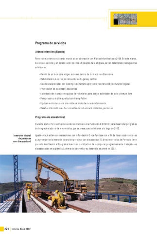 Programa de accesibilidad Durante el año, Ferrovial ha mantenido contactos con la Fundación ADECCO para desarrollar programas de integración laboral de minusvalídos, que se preve puedan iniciarse a lo largo de 2003. Inserción laboral de personas con discapacidad