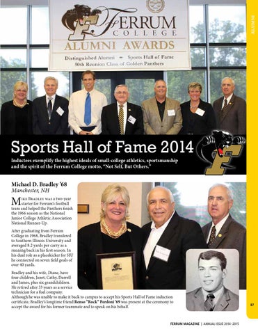 ike Bradley was a two-year starter for Ferrum’s football team and helped the Panthers finish the 1966 season as the National Junior College Athletic Association National Runner-Up. After graduating from Ferrum College in 1968, Bradley transfered to Southern Illinois University and averaged 8.2 yards per carry as a running back in his first season. In his dual role as a placekicker for SIU he connected on seven field goals of over 40 yards. Bradley and his wife, Diane, have four children, Janet, Cathy, Darrell and James, plus six grandchildren. He retired after 33 years as a service technician for a fuel company. Although he was unable to make it back to campus to accept his Sports Hall of Fame induction certificate, Bradley’s longtime friend Renso “Rock” Perdoni ’69 was present at the ceremony to accept the award for his former teammate and to speak on his behalf.