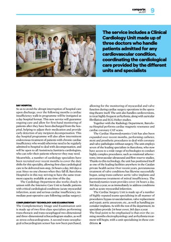 allowing for the monitoring of myocardial and valve function during cardiac surgery operations in the operating theatre itself. The unit also handles cardioversions, to treat highly frequent arrhythmia, along with auricular fibrillation and ECG Holter studies. Together with the Radiology Department, Barcelona Hospital performs cardiac magnetic resonance and cardiac coronary CAT scans. The Cardiac Haemodynamics Unit has also been expanded over recent months, performing catheter, stent and prosthetic procedures to deal with coronary and valve pathologies without surgery. The unit employs seven of the leading specialists in Barcelona, who now have access to a wide range of technologies to conduct highly complex procedures, such as rotational atherectomy, intravascular ultrasound and flow reserve studies. Thanks to this technology, the unit has positioned itself as one of the leading facilities anywhere in the Catalan private health sector. Over recent years, percutaneous treatment of valve conditions has likewise successfully begun, using trans-catheter aortic valve implants and percutaneous treatment of mitral insufficiency. The haemodynamics team provides cover 24 hours a day, 365 days a year, so as immediately to address conditions such as acute myocardial infarction. The Cardiac Surgery Unit is made up of a number of highly reputed teams specialising in all manner of procedures: bypass revascularisation, valve replacement and repair, aortic aneurysm, etc., as well as handling pacemaker implants. As with the rest of the department, its specialists provide 24-hour cover, 365 days a year. The final point to be emphasised is that over the coming months electrophysiology and arrhythmia treatment will begin, with a unit specialising in these conditions.