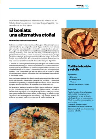 El boniato: una alternativa otoñal núria Jané y Dra. montserrat montraveta Podemos encontrar boniatos casi todo el año, pero si buscamos productos de temporada hay que comprarlos cuando llega el otoño. Así pues, vamos a aprovechar los meses de octubre y noviembre para cocinarlos y saborearlos, ya que son muy nutritivos, ricos en hidratos de carbono (complejos y simples), vitaminas y ácido fólico. Por otra parte, su contenido en grasas es prácticamente inexistente, y a pesar de su dulzura, una vez cocinados, la carga glucémica es baja y la glucosa pasa lentamente hacia la sangre, sin provocar subidas bruscas de insulina. Por los nutrientes que aporta, los boniatos son muy adecuados para introducir en la dieta de los niños y los deportistas. A menudo ha sido un producto menospreciado, pero esta hortaliza tiene numerosos beneficios para nuestro organismo: es rica en metionina (aminoácido esencial poco habitual en el mundo vegetal), en betacarotenos (con conocidos efectos antioxidantes y responsable de su color anaranjado) y en vitamina A y E. También hay que destacar que el 70 % de su peso es agua y lo convierte en un alimento con una alta función depuradora, especialmente si se consume cocido. Los centroamericanos ya cultivaban boniatos cuando Cristóbal Colón atracó en sus costas en 1492. En su cuarto viaje trajo este tubérculo a España para cultivarlo y desde entonces se extendió rápidamente por todo el continente europeo. Actualmente, el 90 % de su producción se localiza en Asia. En la cocina, el boniato es un alimento básico muy versátil que se consume cocido, frito o en puré, como guarnición en platos de carne y pescado, o incluso como ingrediente principal de cremas, dulces y pasteles. Y es que su textura y su sabor hacen que se adapte perfectamente a cualquier receta. Además, nos aporta más vitaminas antioxidantes y más fibra que la patata. Sin embargo, hay que cocinarlo bien porque puede resultar indigesto.