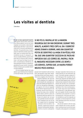 els de la meva generació havíem sentit parlar de les càries, però amb prou feines sabíem res de com calia raspallar-se les dents o dels efectes beneficiosos del flúor o de la necessitat de fer revisions periòdiques al dentista. Fa quaranta anys, la gent anava al dentista només quan feia falta, quan un queixal feia mal o les molèsties bucals hi obligaven. La meva cunyada Antònia, que és més gran que jo, encara és de la vella escola i, com que ha tingut la sort de tenir una dentadura fantàstica, no havia demanat mai hora a aquest especialista fins que va tenir una petita ferida a la boca que va acabar essent un bon problema. En una trobada familiar em vaig adonar que l’Antònia tenia molèsties a l’hora de menjar. Com que jo ho he