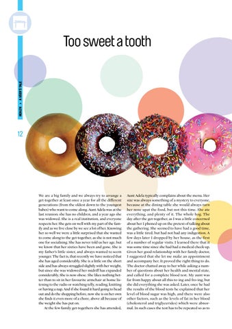 Aunt Adela typically complains about the menu. Her size was always something of a mystery to everyone, because at the dining table she would always turn her nose upat the food, but not this time. She ate everything, and plenty of it. The whole hog. The day after the get-together, as I was a little concerned about her I phoned up on the pretext of talking about the gathering. She seemed to have had a good time, was a little tired, but had not had any indigestion. A few days later I dropped by her house, as the first of a number of regular visits. I learned there that it was some time since she had had a medical check-up. Given her good relationship with her family doctor, I suggested that she let me make an appointment and accompany her. It proved the right thing to do. The doctor chatted away to her while asking a number of questions about her health and mental state, and called for a complete blood test. My aunt was far from happy about all this to-ing and fro-ing, but she did everything she was asked. later, once he had the results of the blood tests he explained that her level of blood sugar was high, and there were also other factors, such as the levels of fat in her blood (cholesterol and triglycerides) which were abnormal. In such cases the test has to be repeated so as to