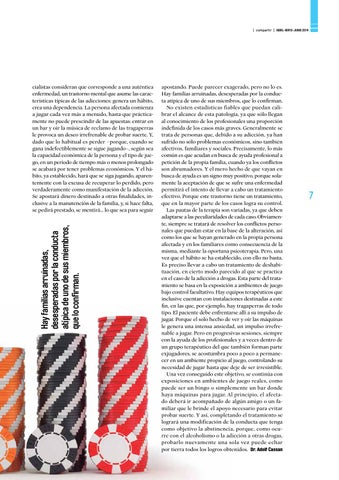 apostando. Puede parecer exagerado, pero no lo es. Hay familias arruinadas, desesperadas por la conducta atípica de uno de sus miembros, que lo confirman. No existen estadísticas fiables que puedan calibrar el alcance de esta patología, ya que sólo llegan al conocimiento de los profesionales una proporción indefinida de los casos más graves. Generalmente se trata de personas que, debido a su adicción, ya han sufrido no sólo problemas económicos, sino también afectivos, familiares y sociales. Precisamente, lo más común es que acudan en busca de ayuda profesional a petición de la propia familia, cuando ya los conflictos son abrumadores. Y el mero hecho de que vayan en busca de ayuda es un signo muy positivo, porque solamente la aceptación de que se sufre una enfermedad permitirá el intento de llevar a cabo un tratamiento efectivo. Porque este trastorno tiene un tratamiento, que en la mayor parte de los casos logra su control. Las pautas de la terapia son variadas, ya que deben adaptarse a las peculiaridades de cada caso. Obviamente, siempre se tratará de resolver los conflictos personales que puedan estar en la base de la alteración, así como los que se hayan generado en la propia persona afectada y en los familiares como consecuencia de la misma, mediante la oportuna psicoterapia. Pero, una vez que el hábito se ha establecido, con ello no basta. Es preciso llevar a cabo un tratamiento de deshabituación, en cierto modo parecido al que se practica en el caso de la adicción a drogas. Esta parte del tratamiento se basa en la exposición a ambientes de juego bajo control facultativo. Hay equipos terapéuticos que inclusive cuentan con instalaciones destinadas a este fin, en las que, por ejemplo, hay tragaperras de todo tipo. El paciente debe enfrentarse allí a su impulso de jugar. Porque el solo hecho de ver y oír las máquinas le genera una intensa ansiedad, un impulso irrefrenable a jugar. Pero en progresivas sesiones, siempre con la ayuda de los profesionales y a veces dentro de un grupo terapéutico del que también forman parte exjugadores, se acostumbra poco a poco a permanecer en un ambiente propicio al juego, controlando su necesidad de jugar hasta que deje de ser irresistible. Una vez conseguido este objetivo, se continúa con exposiciones en ambientes de juego reales, como puede ser un bingo o simplemente un bar donde haya máquinas para jugar. Al principio, el afectado deberá ir acompañado de algún amigo o un familiar que le brinde el apoyo necesario para evitar probar suerte. Y así, completando el tratamiento se logrará una modificación de la conducta que tenga como objetivo la abstinencia, porque, como ocurre con el alcoholismo o la adicción a otras drogas, probarlo nuevamente una sola vez puede echar por tierra todos los logros obtenidos. Dr. Adolf Cassan
