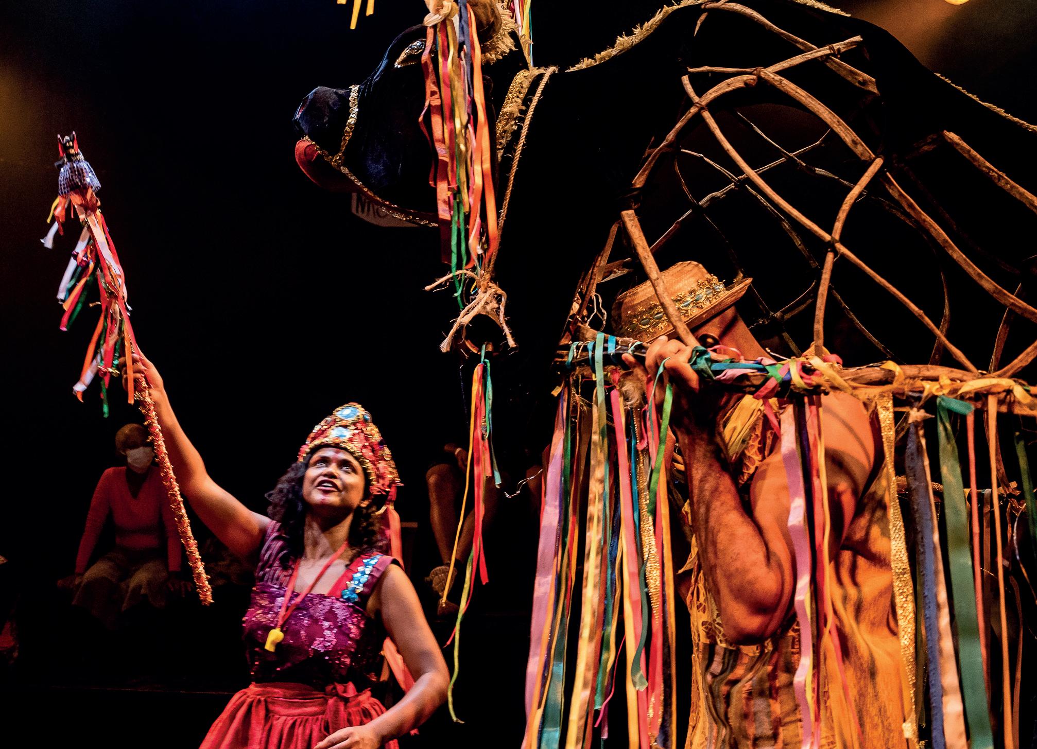 Karaíba é a adaptação do livro homônimo de Daniel Munduruku, onde só a imaginação nos faz seguir e entender as palavras e as profecias de um passado e um presente vivos em nós. Imaginar é o que permite aos seres humanos conceber outras realidades, outras histórias. Neste espetáculo, o convite é para imaginarmos essas terras 522 anos antes de tantas caravelas. Imaginar os povos Tupinikin, Turyaçu e Anhangás que aqui viviam e vivem, seus conflitos e seu modos de ver o mundo. Imaginar o karaíba percorrendo pelos caminhos de Pindoretá junto de Perna Solta, Maraí, Potyra e Periatã, personagens dessa nossa odisséia sonora teatral