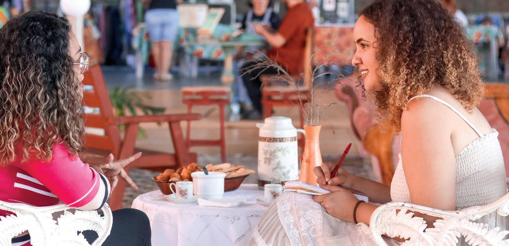 ‘dois CAFÉS por uma MEMÓRIA’ é um convite ao público para vivenciar a experiência da atriz Geovanna Leite com a pesquisa de saberes ancestrais culinários caseiros e, por meio desse estímulo, resgatar e compartilhar suas próprias memória. Sentada à mesa com dois lugares, um café fresco e algumas amostras das receitas caseiras aprendidas com sua avó. A lousa, com o nome da performance, é o convite para espectador(a)(e) sentar e contar, em troca de um café e um quitute, alguma receita, memória afetiva ou segredo culinário ancestral.