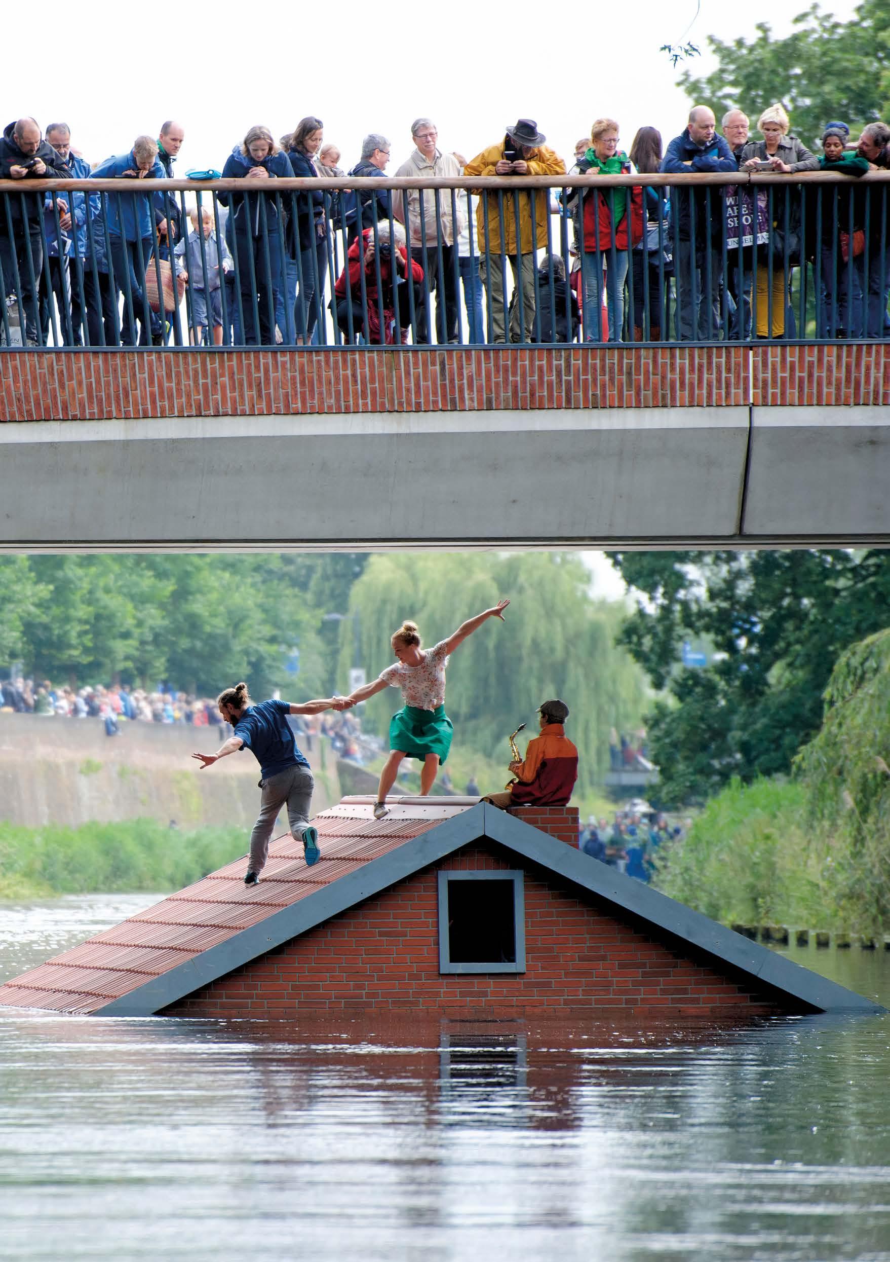 need for active, change-making hope to address global warming and rising ocean levels, is given urgent voice in Sliding Slope, from the Dutch company Vloeistof, in Royal Docks.