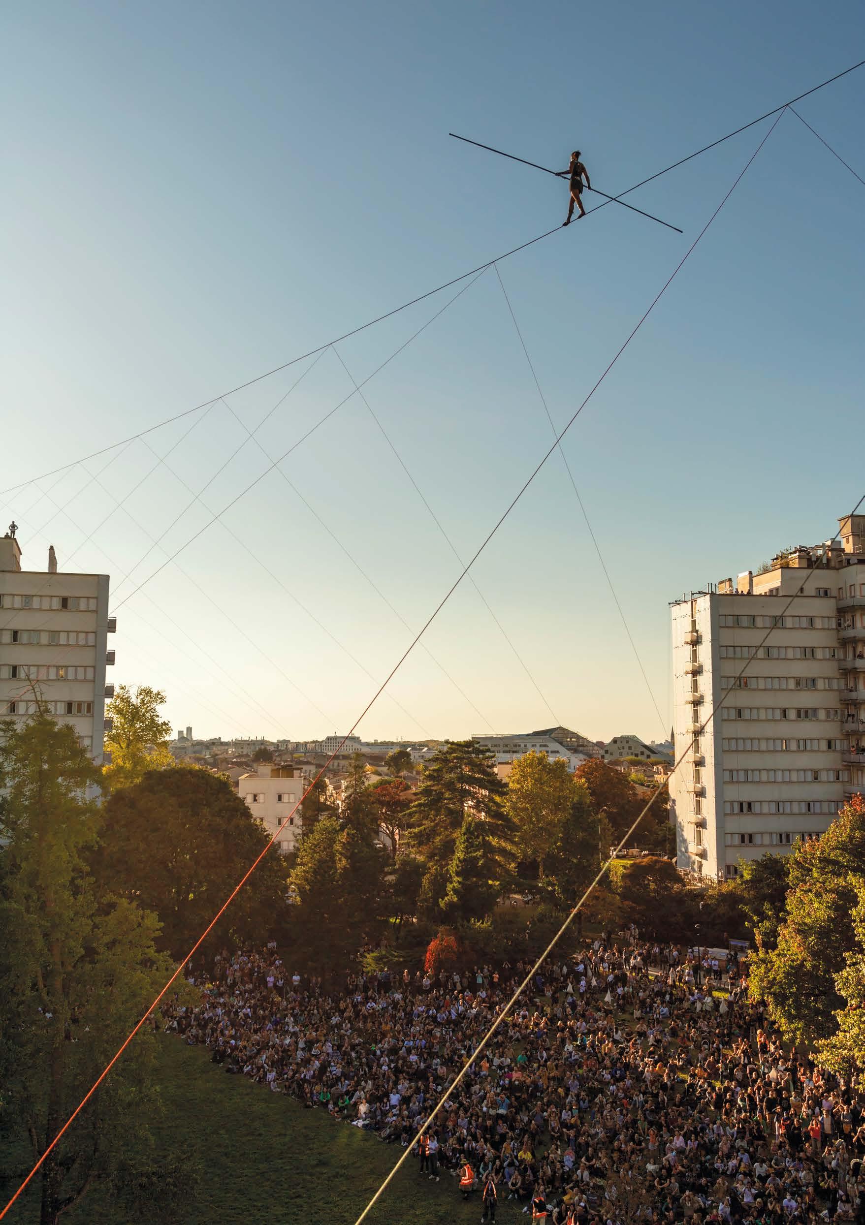 One woman. One high wire. This heart-stopping spectacle is performed by internationally renowned tight-rope walker Tatiana-Mosio Bongonga. With the help of twelve extraordinary people drawn from the local community, she will make an astonishing crossing, opening GDIF 2023 with an act of fearless optimism.
