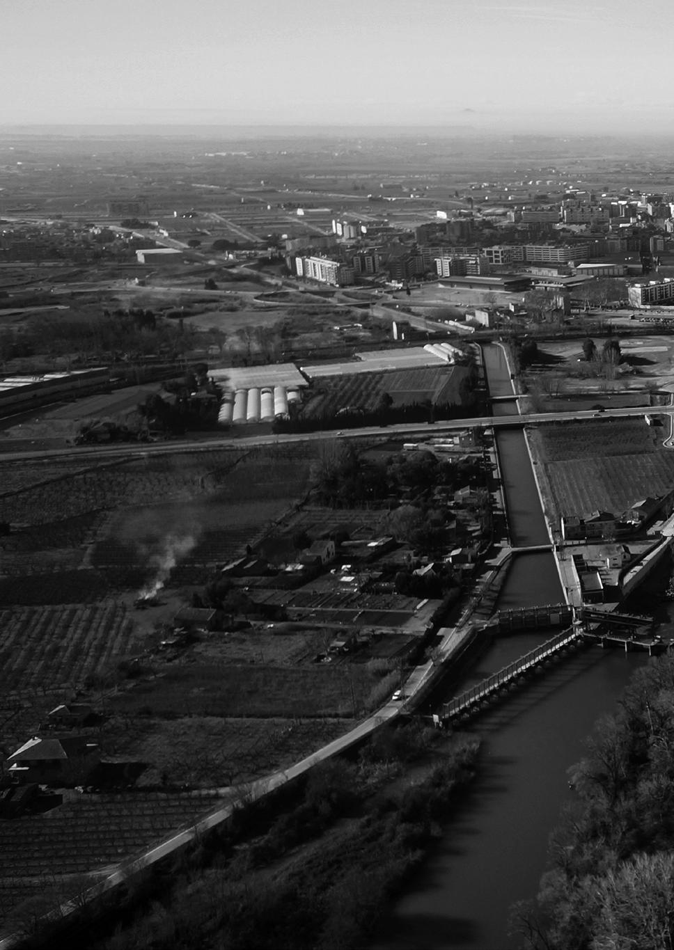 It begins with Luz Broto’s intervention —two pictures which were part of the original installation are shown here. The basis of the work consisted of literally and minutely increasing the flow of the Segre River in Lleida, which has been lower for a century due to economic interests. Preserving the relationship of visual scales or volumes of the project, one of the images is the furtive view of the hidden hose from which the water gushed into the river, while the other shows an aerial view of the river running through the territory with its imperceptibly increased flow.