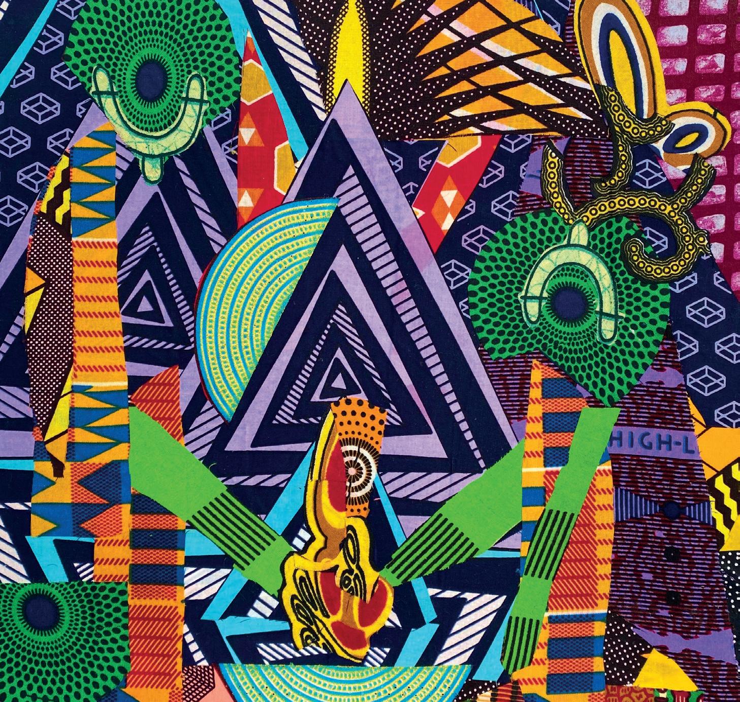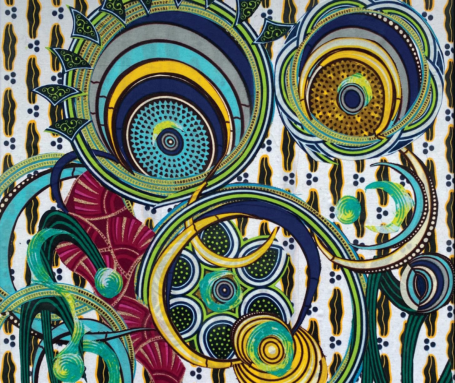 C’est en terre africaine qu’elle trouve son inspiration pour sa création en découvrant les pagnes africains. Aujourd’hui le tissu waxprint avec lequel elle travaille la plupart de ses créations, représente une part de l’identité de L’Afrique de l’Ouest. Ces tissus aussi variés que beaux et chargés de symboles inhérents à certaines cultures africaines mènent au cœur du travail de l’artiste : elle considère le textile comme un symbole de culture. Depuis 2021 elle a commencé à travailler avec le tissu shweshwe de l’Afrique du Sud, ainsi qu’avec d’anciens tissus de la Côte d’Ivoire, enrichissant son vocabulaire graphique.