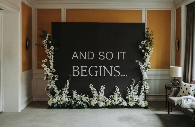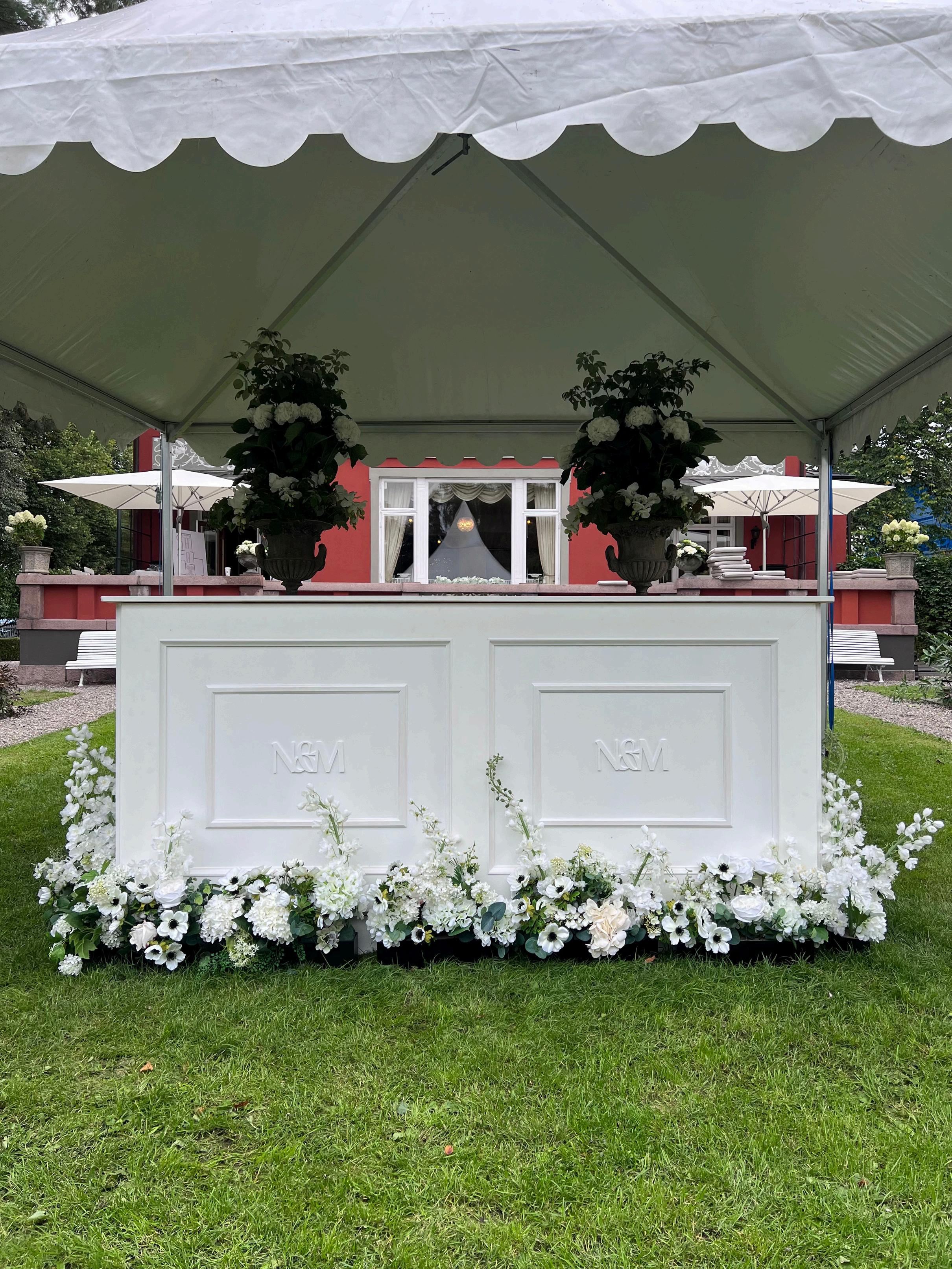 Vi leverte kunstige blomster på bord og som ble tatt opp på backdrop og på skilt.