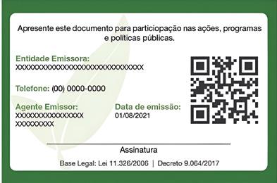 Instituído pelo decreto 9.064/2017, o CAF identifica e qualifica a Unidade Familiar de Produção Agrária (UFPA), o Empreendimento Familiar Rural (EFR) e as formas associativas de organização da agricultura familiar, com o objetivo de acesso às políticas públicas destinadas à agri cultura familiar.